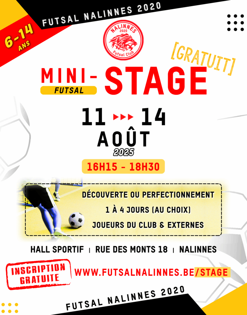 | Lundi 11/08/25 | 16h15 – 18h30 | Rue des Monts 18 Nalinnes |